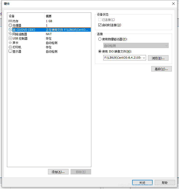 选择“新CD/DVD(IDE)”可以选择光驱配置。如果选择“使用物理驱动器”,则虚拟机会使用宿主机的物理光驱;如果选择“使用 ISO 映像文件”,则可以直接加载 ISO 映像文件,单击“浏览”按钮找到 ISO 映像文件位置即可,
