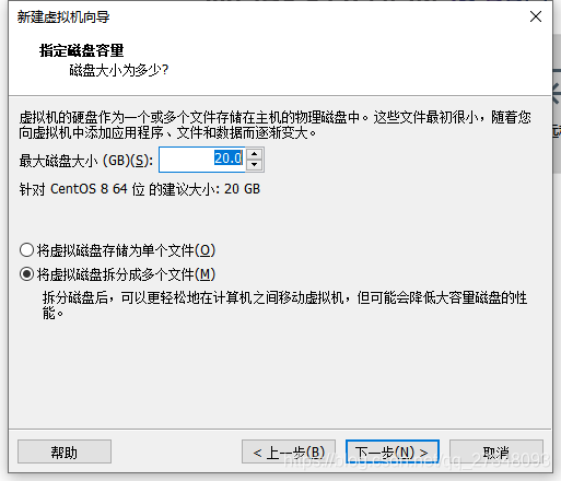 选择磁盘大小。一般如果学习Linux命令几个GB就行了,不需要太大。一般选择默认20GB,下面选择默认的“将虚拟磁盘拆分成对个文件”,点击下一步