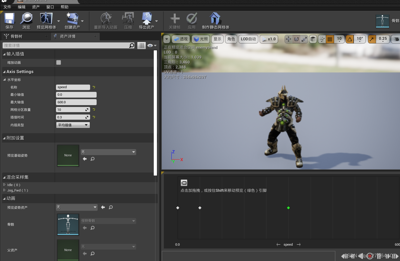 通过混合动画控件1d制作角色的不同状态下的动作,并由动画蓝图的状态机中载入。