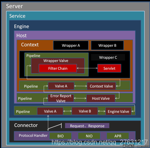 7. 那些个小箭头,里面写着value的那个大家也注意看一下,这个也很重要,在Tomcat进行逻辑处理的时候,在每一个组件里面是通过Pipeline(管道)来进行处理的。这里大家可能不理解,大家应该都写过filter吧,每一个filter写完之后有一个doFilter(request,response)的方法,意思就是交给下一个过滤器。这里意思是一样的,就是这个小组件处理完了交给下一个小组件,全部处理完了才交给下一级。这里体现出的是设计模式中的责任链模式。
