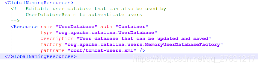 我们可以直接从java代码里的MemoryUserDatabaseFactory这个接口拿对应的实例。这个例子最终指向tomcat-users.xml文件,负责管理用户授权。举个例子,如果碰到需要将数据库的数据源这些配置在tomcat里面的时候,就可以用这种配置方式。