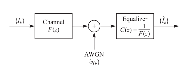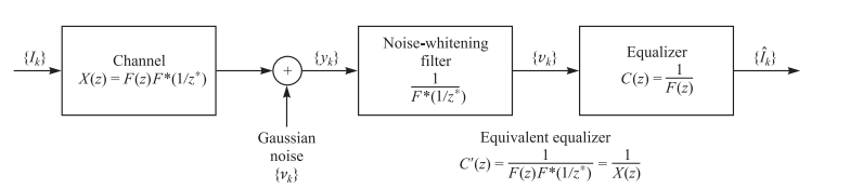 其中,C (z) 表示 的 z 变换。需要注意的是,传递函数为 C (z) 的均衡器其实就是线性滤波器模型 F (z) 的逆滤波器。换言之,要完全消除码间干扰,需要使用 F (z) 的逆滤波器,我们将这种滤波器称为迫零滤波器。下图展示了带迫零均衡器的信道框图。