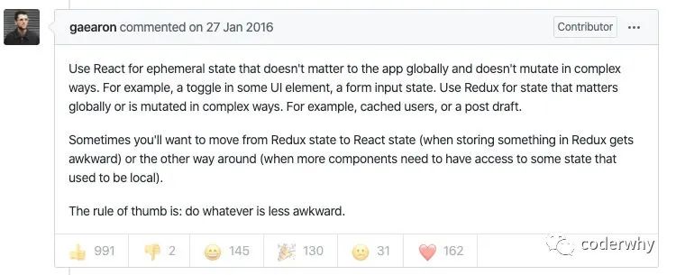 针对React使用setState还是Redux中的Store来管理状态哪个更好的问题,Redux的issue上,Redux的作者Dan Abramov,它这样回答的: