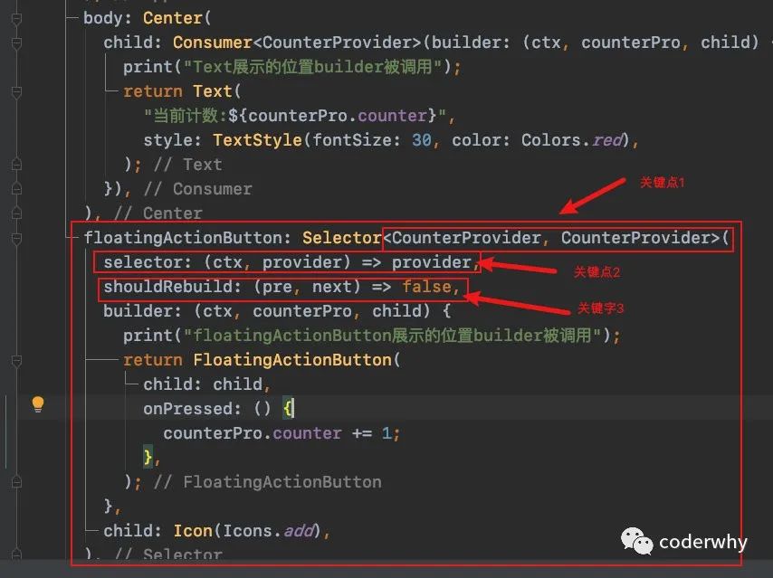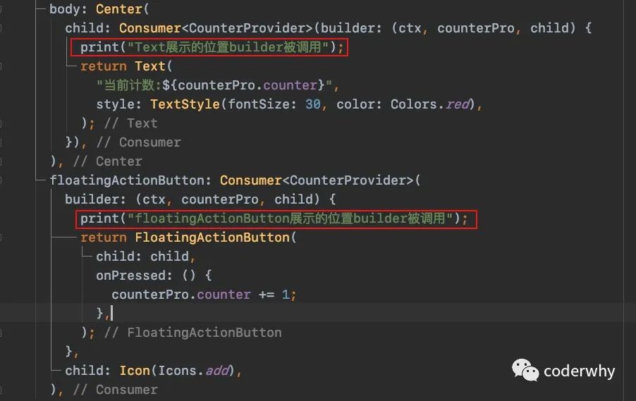 参数三:child,目的是进行优化,如果builder下面有一颗庞大的子树,当模型发生改变的时候,我们并不希望重新build这颗子树,那么就可以将这颗子树放到Consumer的child中,在这里直接引入即可(注意我案例中的Icon所放的位置)