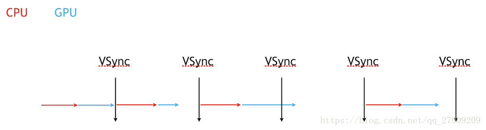 1:一开始由cpu先往右边走,随着时间推移,cpu做好之后交给gpu进行渲染,接着来了一个垂直同步信号,就会将刚才cpu计算好,gpu渲染好的数据显示到屏幕上,完成刚才这一帧的显示,(一旦来了一个垂直同步信号,会立马将gpu渲染的数据显示到屏幕上,并且马上开始下一帧的操作),