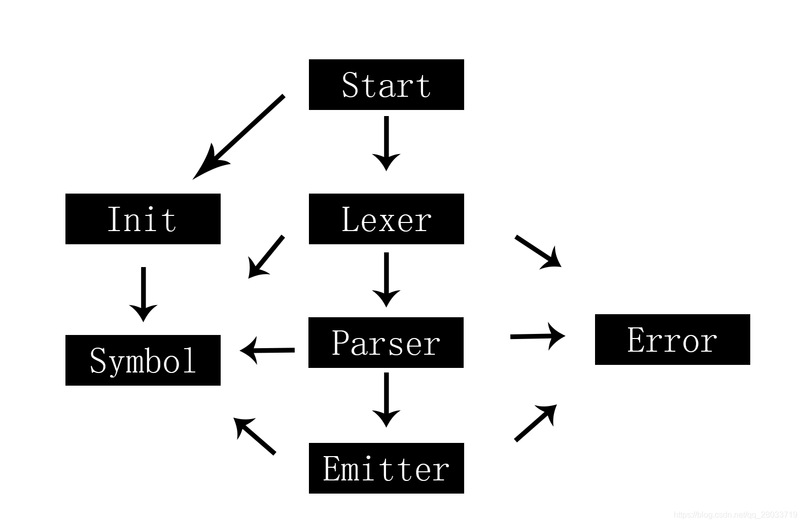 词法分析器模块(lexer)| 语法分析器模块(parser)| 输出模块(emitter)| 符号表模块(symbol init)| 错误处理模块(error)