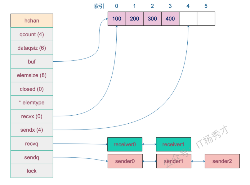队列中的元素:每个被阻塞的发送者 goroutine 被打包成一个 sudog 节点。