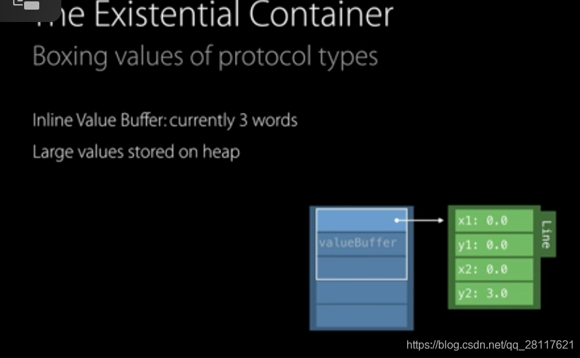3.2.2Existential Container 如上图所示,由于每一个结构体类型的内存大小各不相同,为了保障数组的字节对齐。使用Existential Container的方式把每个struct对象存入数组中,Existential Container前三个valueBuffer用于存放struct的数据,剩余两个分别引用自己的vwt和pwt。需要注意的是如果结构体的属性过多(big value),那么会开辟一块堆区内存,然后valuebuffer对这块内存进行引用。为了管理Existential Container 存放的值,所以引用value-Witness-Table创建内存,初始化以及内存销毁。