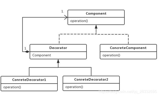 Decorator(装饰器抽象类):实现Component 的抽象类,封装了一个Component 的引用,也就是被装饰的对象