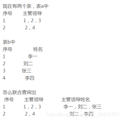 select * ,主管领导姓名=stuff((select ','+姓名 from B where charindex(','+convert(varchar,b.序号),','+a.主管领导)>0 for xml path('')),1,1,'') from A