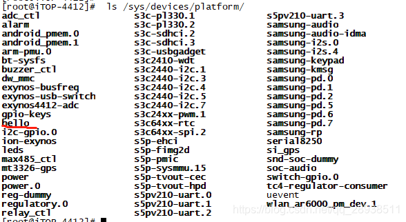 再结合我们前面在Kconfig文件中添加编译HELLO设备的宏定义。这样就完成一个设备的注册。最后将内核编译一下。将新的镜像zImage下载到开发板上。启动开发板,输入: ls /sys/devices/platform/,就可以查看到新添加的设备。