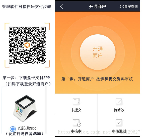 1、按图下载盒子支付APP 2、登录提交资料等待审核 3、软件设置扫码设置M800