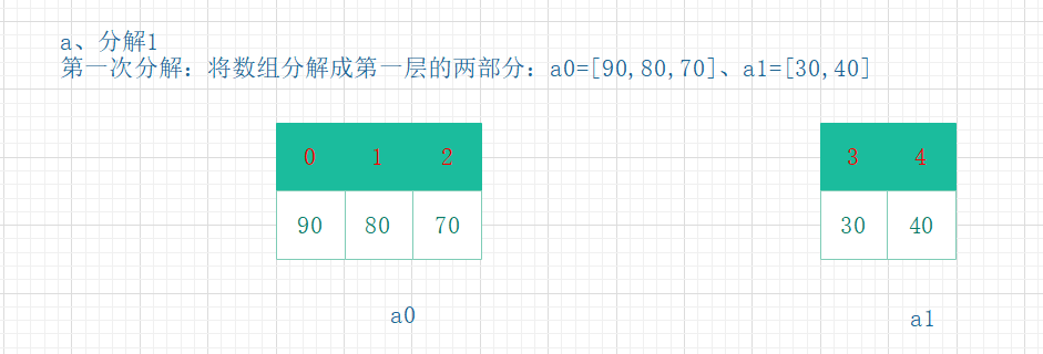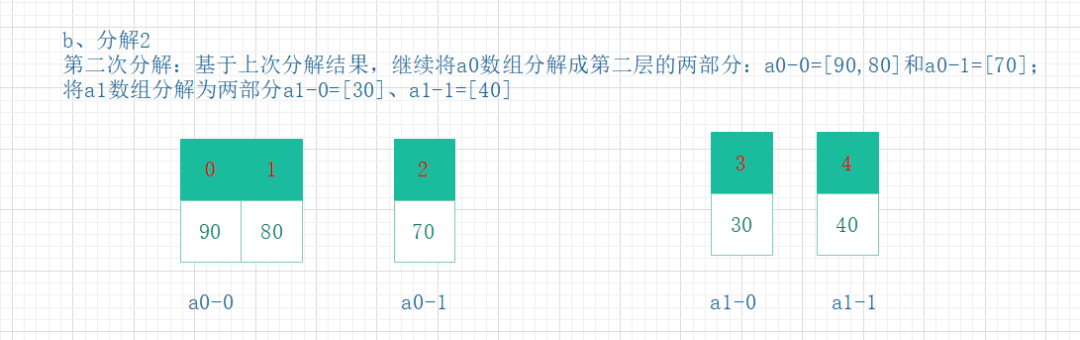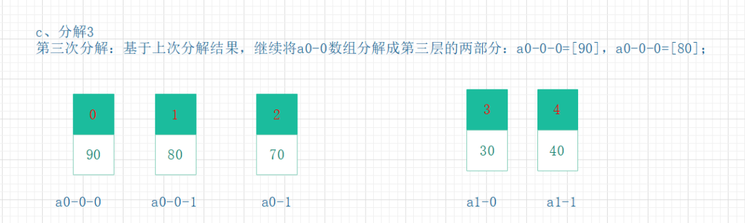 将步骤1分成的两部分,再分别进行递归分解。直到所有部分的元素个数都为1