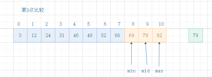 下面我们结合图例解析二分查找的执行流程,在顺序排列的序列中寻找目标值79:
