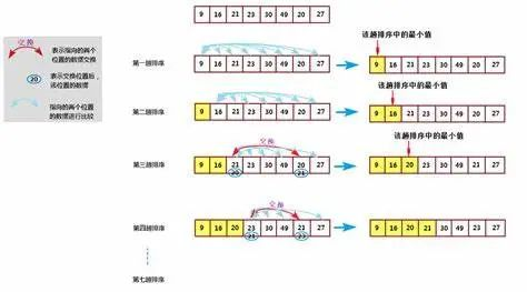 对于给定的一组记录,经过第一轮比较得到最小的记录,然后将该记录与第一个记录位置交换;然后(除去第一个)对其他记录进行第二轮比较,最小与第二个记录位置交换,重复过程至剩下一个。