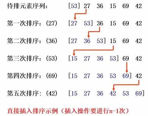 从第二个记录开始,与第一个组成子序列,比较选出最小者,插入到最前方(索引为0),此时两个元素为有序序列;然后加入第三个元素组成新的序列,根据大小将其插入到有序序列中;依次插入所有元素后,直至停止。