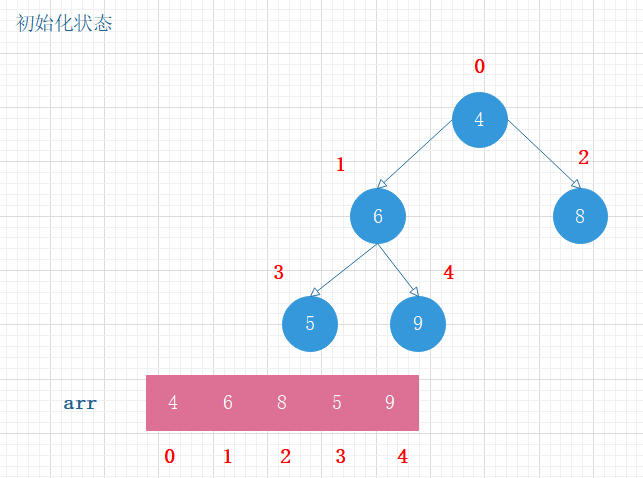 下面举个例子,我们拥有一个完全二叉树:[4,6,8,5,9],我们将如何通过堆排序完成对这个二叉树的排序呢?