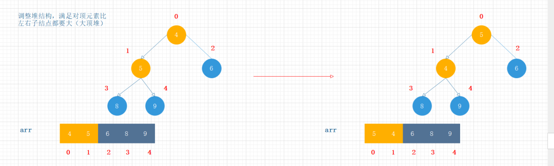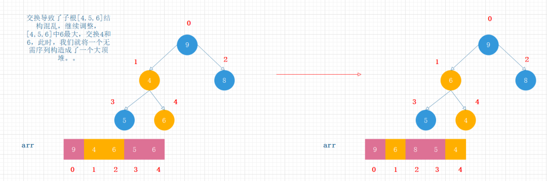 交换导致了子根[4,5,6]结构混乱,继续调整,[4,5,6]中6最大,交换4和6,此时,我们就将一个无需序列构造成了一个大顶堆。