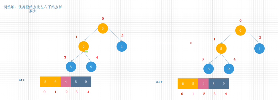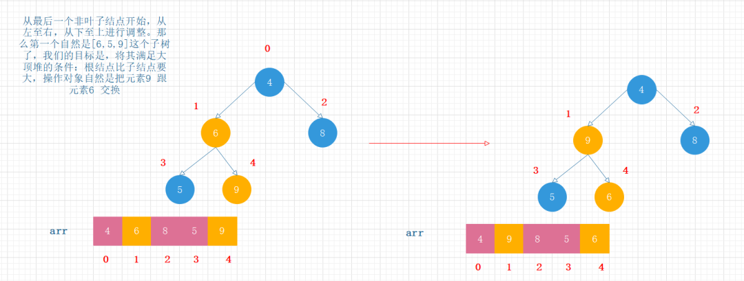 第一自然是[6,5,9]这个子树了,我们的目标是,将其满足大顶堆的条件:根结点比子结点要大,操作对象自然是把元素9 跟元素6 交换位置。