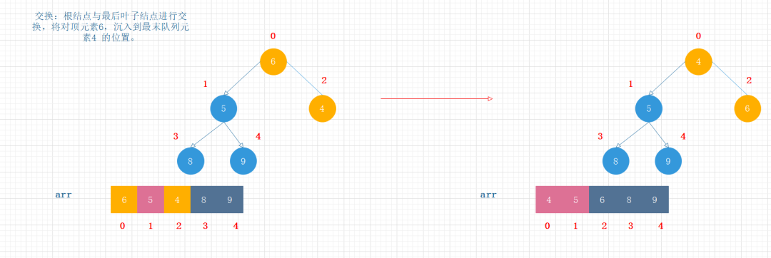 e.交换:根结点与最后叶子结点进行交换,将对顶元素6,沉入到最末队列元素4 的位置。