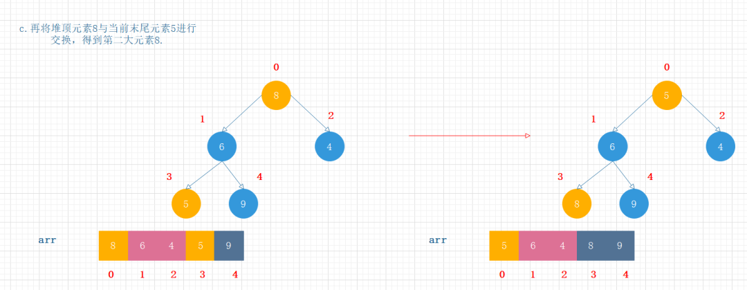 c.交换:将堆顶元素8与当前末尾元素5进行交换,得到第二大元素8成为了倒数第二个元素。