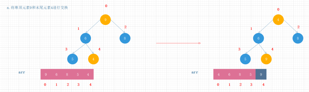 a.交换:将堆顶元素9和末尾元素4进行交换