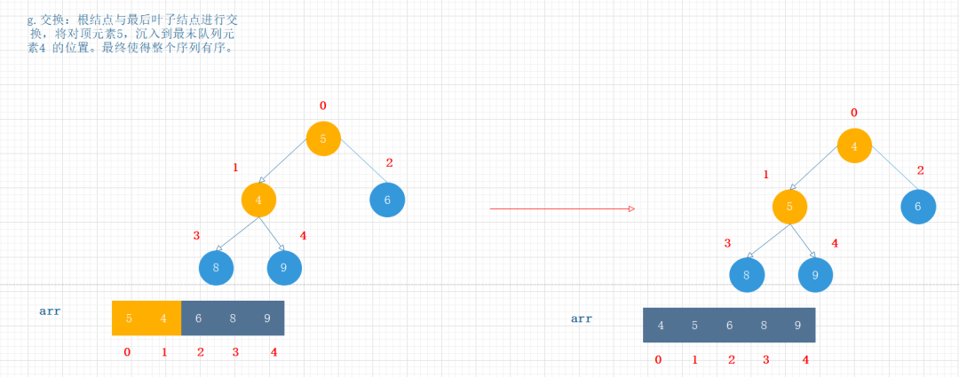 g.交换:根结点与最后叶子结点进行交换,将对顶元素5,沉入到最末队列元素4 的位置。最终使得整个序列有序。