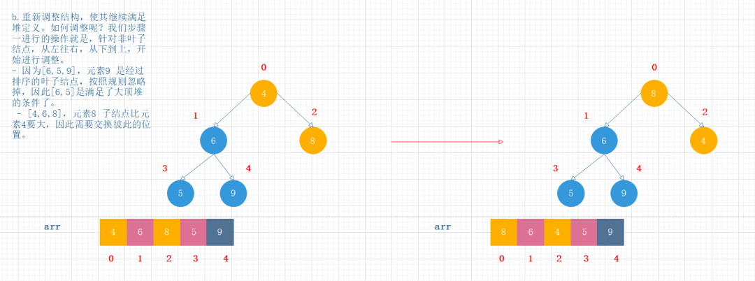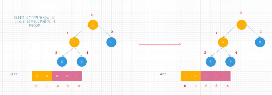 找到第二个非叶节点4,由于[4,9,8]中9元素最大,4和9交换