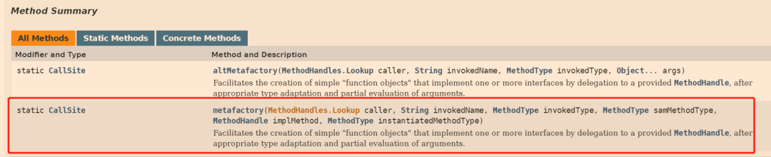 https://docs.oracle.com/javase/8/docs/api/java/lang/invoke/LambdaMetafactory.html#metafactory-java.lang.invoke.MethodHandles.Lookup-java.lang.String-java.lang.invoke.MethodType-java.lang.invoke.MethodType-java.lang.invoke.MethodHandle-java.lang.invoke.MethodType-