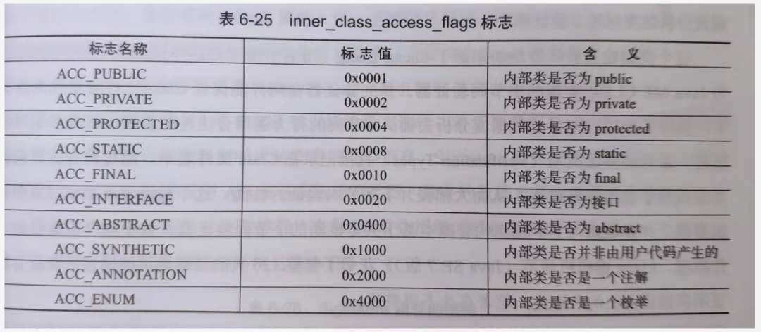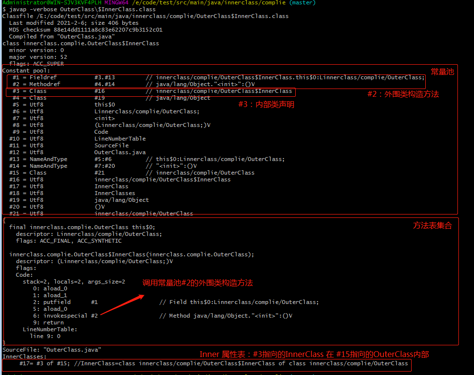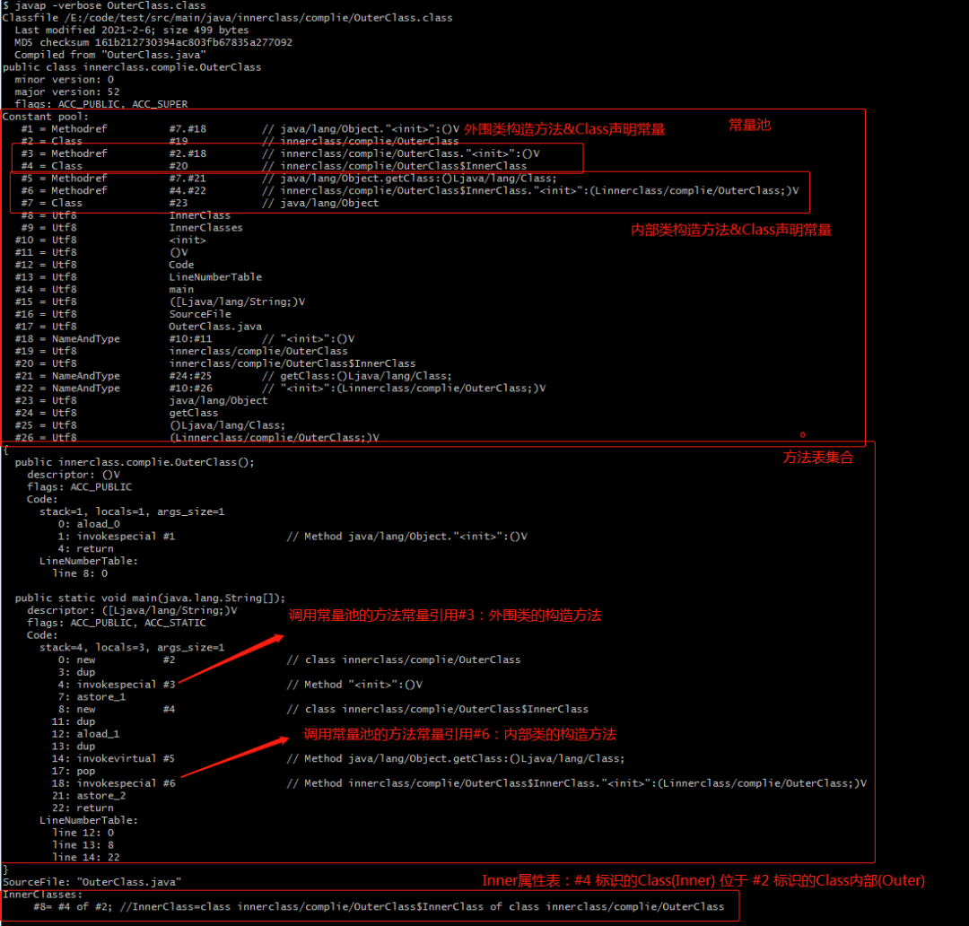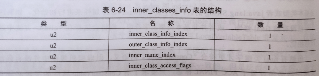 OuterClass$InnerClass.class:对于内部类编译的类文件,我们同样分析常量池、方法表集合、Inner属性表。