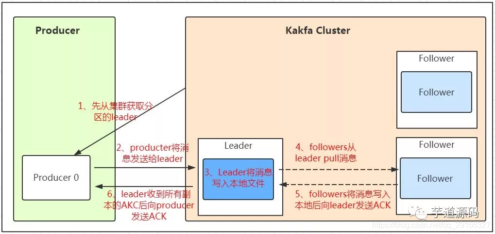 发送的流程就在图中已经说明了,就不单独在文字列出来了!需要注意的一点是,消息写入 Leader 后,Follower 是主动的去 Leader 进行同步的!