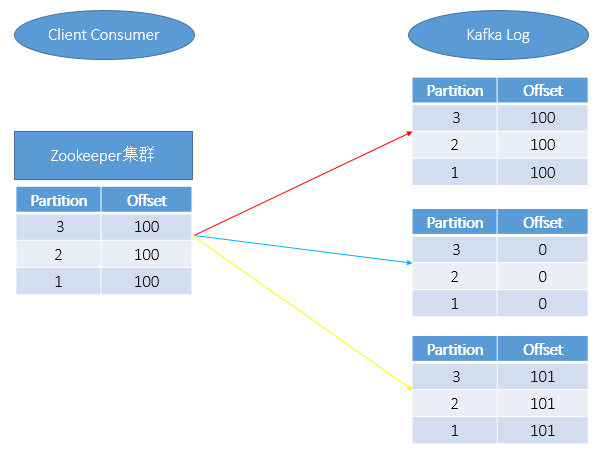 一般正常情况,如果想让Kafka客户端正常消费,那么需要Zookeeper和Kafka Log中的记录保持如上图黄色所示。