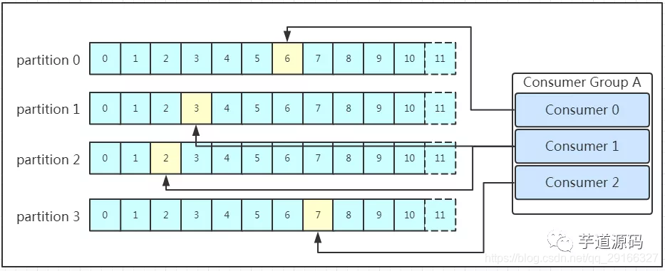 图示是消费者组内的消费者小于 Partition 数量的情况,所以会出现某个消费者消费多个 Partition 数据的情况,消费的速度也就不及只处理一个 Partition 的消费者的处理速度!