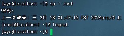 先切换到root用户,然后ctrl+d,显示logout,可以看到下面用户已经变为wyc了