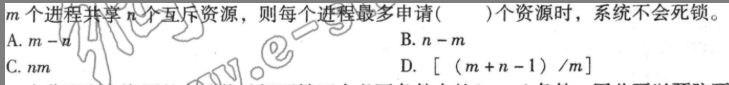 D. 死锁是系统提供的资源少于进程所需要的资源总数所引起的, 每个进程最多申请x个资源而不产生死锁。 m*(x-1)+ 1 = n 求出:x =D选项、 解析: 每个进程申请(x-1)个资源时,各个进程都需要等待其他进程释放资源,此时共 m *(x-1)个资源,系统 会产生死锁; 只要再多一个资源,就可以打破死锁的僵局。