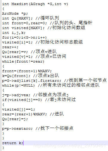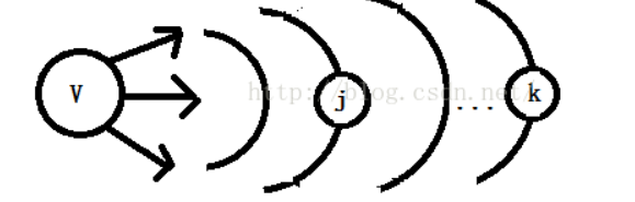 思想:图G是不带权的无向连通图,一条边的长度为1,因此,求距离顶点v的最远的顶点,即求距离顶点v的边数最多的顶点。利用广度优先遍历算法,从v出发进行广度遍历,类似于从顶点v出发一层层地向外扩展,到达j, …,最后到达的一个顶点k即为距离v最远的顶点。遍历时利用队列逐层暂存各个顶点,最后出队的一个顶点k即为所求。如图所示: