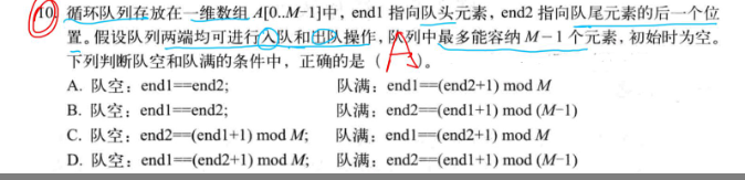 end1指向队头元素,那么可知出队的操作是先从A[end1]读数,然后end1再加1。end2指向队尾元素的后一个位置,那么可知入队操作是先存数到A[end2],然后end2再加1。若把A[0]储存第一个元素,当队列初始时,入队操作是先把数据放到A[0],然后end2自增,即可知end2初值为0;而end1指向的是队头元素,队头元素的在数组A中的下标为0,所以得知end1初值也为0,可知队空条件为end1==end2;然后考虑队列满时,因为队列最多能容纳M-1个元素,假设队列存储在下标为0到下标为M-2的M-1个区域,队头为A[0],队尾为A[M-2],此时队列满,考虑在这种情况下end1和end2的状态,end1指向队头元素,可知end1=0,end2指向队尾元素的后一个位置,可知end2=M-2+1=M-1,所以可知队满的条件为end1==(end2+1)mod M,选A