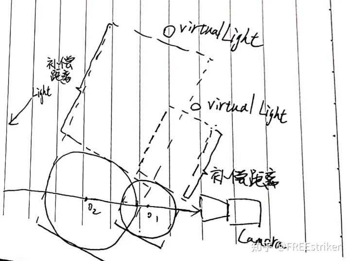 首先根据各个平截头体的外接圆,以及一个补偿距离来建立虚拟灯光相机,之所以使用补偿距离来确定虚拟灯光相机的位置,是因为我没有类似于八叉树那样的场景管理系统,可以快速的得到阴影投射物的最远坐标,所以只能通过手动设置的方法,保证阴影投射正确。(着实莫得办法才能这样)