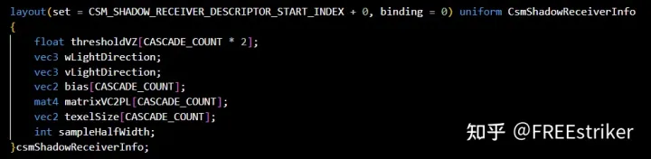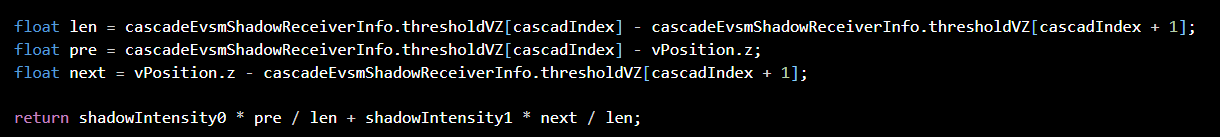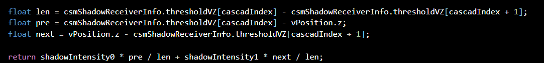 thresholdVZ是子平截头体的近平面和远平面的View空间的Z坐标,而且由于是交错分布的,所以就可以找到片元所在的一个或是两个平截头体。我将bias也分成了多份,近处的bias和远处的bias应该是不同的,因为一个阴影贴图的像素所占的世界坐标的大小是不同的,所以我感觉还是分开比较好。matrixVC2PL就是之前计算出来的转换矩阵,将片元从相机的View空间转换到灯光相机的Projection空间。后面两个参数就是用来确定PCF采样的。