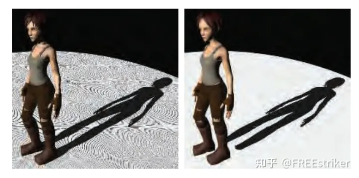 这时候只要在比较时,手动的添加一个偏移值bias,让片元离得近那么一丢丢,避免出现条纹现象。