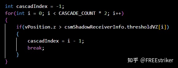 如果是-1,就说明在最近的平面和最远的平面之外,否做就是右侧的平面的索引值。如果这个值是偶数,那么他就使用(cascadIndex + 1) / 2来使用对应平截头体的数据;如果他是奇数,那么说明这个片元处于两个平截头体的重叠部分,就再使用cascadIndex / 2使用另一个平截头体的数据,最后在对两个平截头体进行混合就好了。