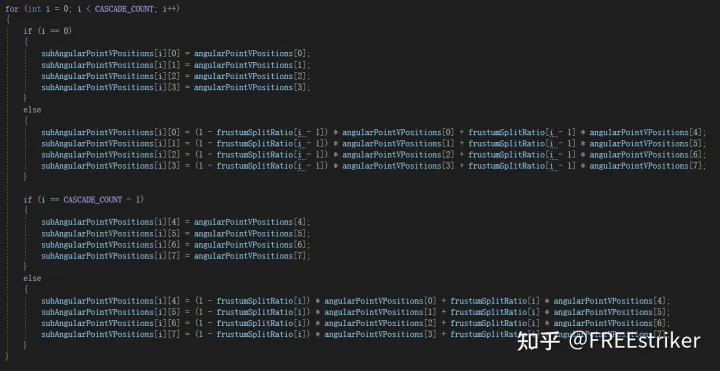 接下来就是使用这么几个比例,对前面的八个角点进行线性插值就可以得到各个子平截头体了。