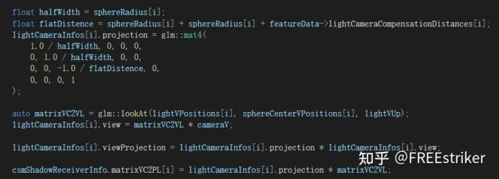 因为涉及到将片元从相机的View空间转换到灯光相机的Projection空间,所以需要算一个转换矩阵,我是这样计算的: