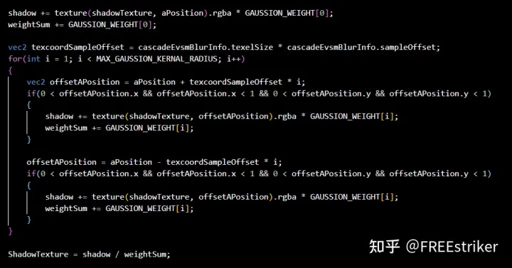 VSM用的是一种完全不同的思路,它是将模糊区域内的阴影值当做一个概率值,使用单边切比雪夫不等式,获得阴影贴图的深度比片元深度更深的概率,概率越大,说明片元越亮,反之越暗。单边切比雪夫的推导可以去B站上找一找。