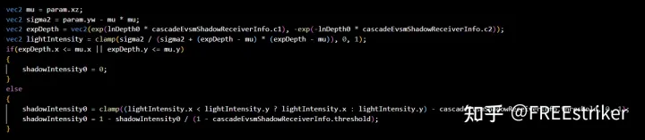 具体的计算就是对ShadowMap进行采样,记录深度与深度的平方,接着进行模糊,这样就可以得到一阶矩 μ 和二阶矩 μ2 ,之后就用一阶矩和二阶矩来计算方差,然后就使用上面的函数进行计算就可以了,非常巧妙。