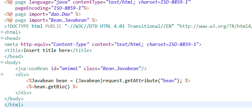 6、jsp里输入<jsp:useBean id="自己给你的javabean取个名字吧" class="你需要导入的javabean包"/>