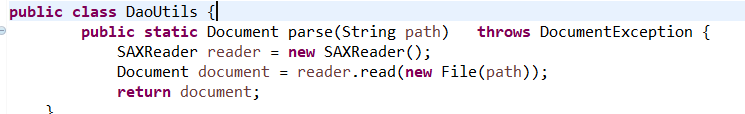 2、我们现在解析xml文件,这里我用的是dom4j来解析xml文件,创建一个方法调获取到文档对象(dom4j使用很简单,百度一下教程,十几分钟就能学会)。dom4j解析xml文档这段代码单独放一个包里面。