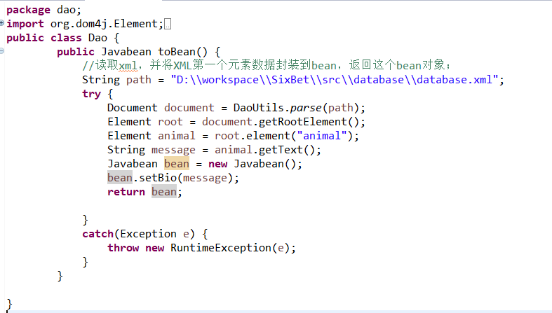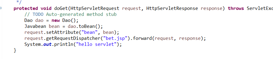 5、创建一个servlet名字我就叫作betservlet,这里不熟的同学可以直接百度eclipse创建servlet(傻瓜式创建,在doGet()方法里写代码),这里将调用步骤4类(别忘记创建对象)里面创建的方法拿到封装好的javabean对象,这时候要调用servlet里面的一个对象request的setAttribute("你创建的对象的名字",你创建的对象的名字),然后在调用request.getRequestDispatcher(“你创建的jsp文件”).forward(request,response) 这些弄完以后就要去web.xml(这个文件你在用eclipse创建web工程的时候就有了,在lib文件夹里)里面配置servlet了,这个很简单自行百度吧,几分钟就能学会。