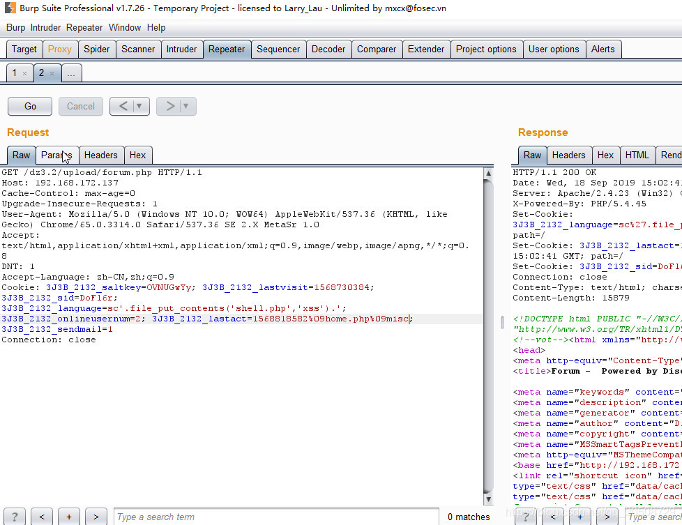 本文记录了在Windows 2003服务器上利用phpStudy搭建Discuz! ML 3.x论坛的过程,并详细描述了在渗透测试中遇到的代码执行漏洞,包括安装步骤、数据库连接问题以及利用burp suite抓包测试代码执行的情况。尽管成功执行了`phpinfo()`,但一句话木马注入被拦截,推测可能与特殊字符有关,目前问题尚未解决,期待进一步探讨。