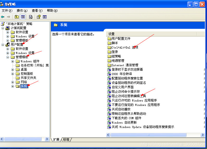 step2:进入到本地组编辑器----“用户配置”----“管理模板”----“系统”